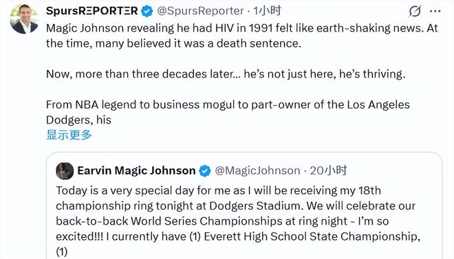 NBA记者加尔扎转发了魔术师的这番言论,并配文写道:“1991年魔术师约翰逊公开自己感染HIV的消息,在当时无异于晴天霹雳。那时很多人都认为,这等同于一纸死亡判决。三十多年过去,他不仅好好活着,而且活得无比精彩。从NBA传奇,到商业巨头,再到洛杉矶道奇队股东,他的人生早已超越篮球本身。这也见证了医学的进步、认知的普及,以及人性韧性的伟大。”